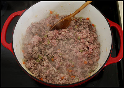 Step 4: Add in the meats about 1/3 at a time so they cook evenly. Stir as you add to incorporate the meats and to ensure it's fully cooked. I like to buy 1 pound each of ground beef, ground pork and ground veal. I usually buy leaner meats but it is not required.