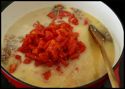 Step 5: Add in 1 cup of white wine and scrap any bit that may be on the bottom of the pan. Cook for 2-5 minutes to cook out the alcohol (keep a glass of wine handy for yourself!). Add in the milk, tomatoes and beef broth and stir to combine.