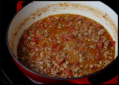 Step 6: Bring to a boil then reduce to a simmer. Simmer for at least 4 hours stirring occasionally so that the flavour develops. After a few hours, the colour will deepen and the sauce will thicken.